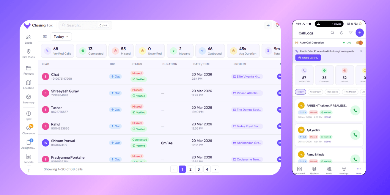 ClosingFox automatically logs every call your team makes — duration, direction, and outcome. No manual entry. Works in the background on Android.