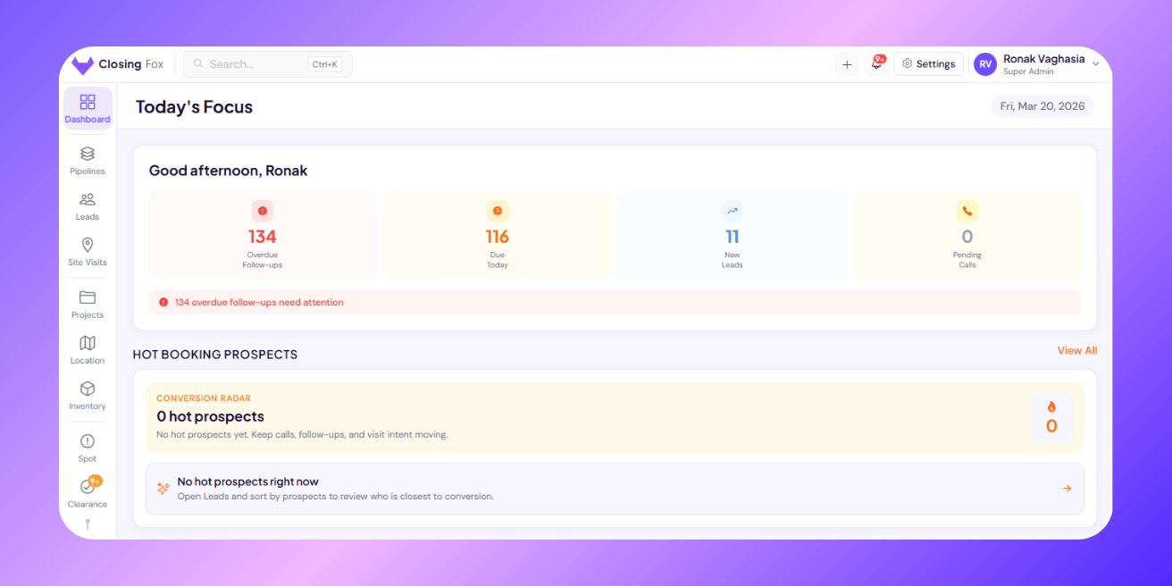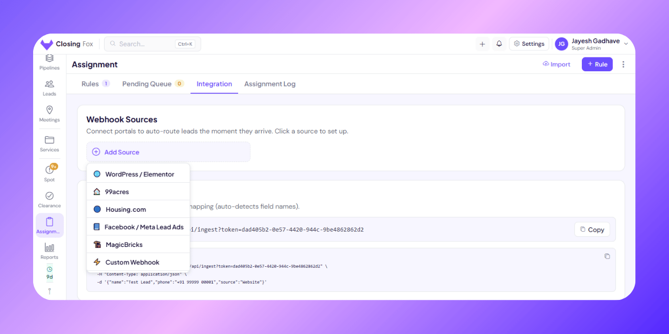 Auto-capture leads from 99acres, Housing.com, MagicBricks, Facebook Ads, and custom sources — set up in under 5 minutes.