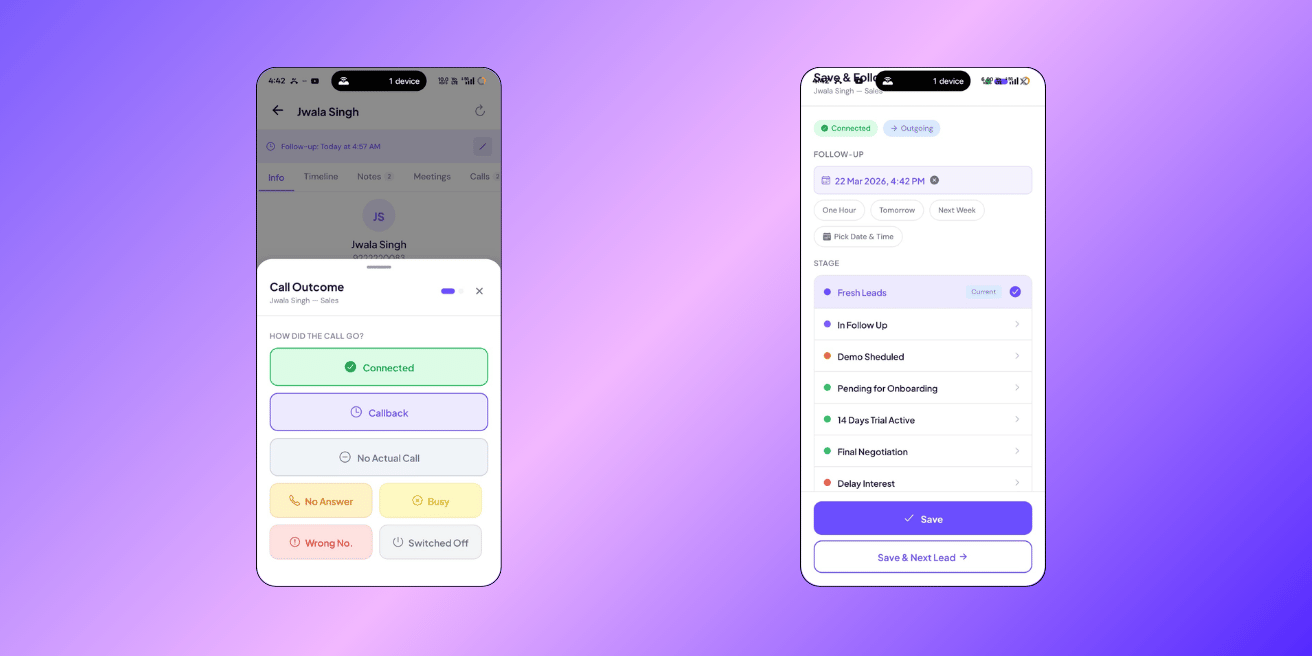 After every call, 3 taps: what happened, what’s next, save. Every call logged, every follow-up scheduled, nothing forgotten.