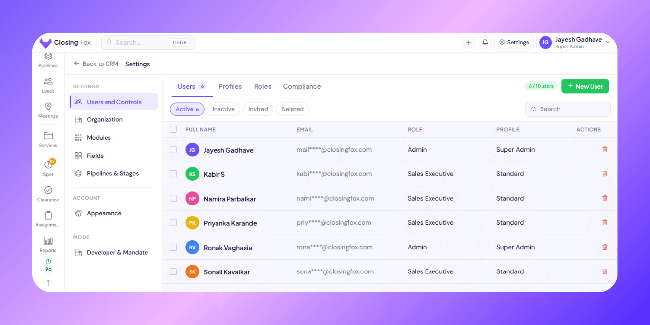 Add your team to ClosingFox, set permissions with profiles, and control who sees whose leads with roles. Set up in 5 minutes.