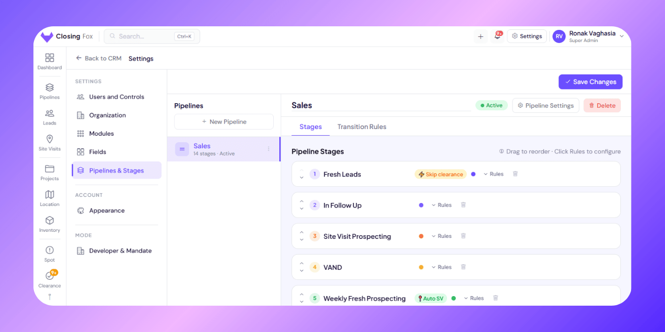 | Require Custom Fields | Forces your team to fill key fields before moving the lead out | Great for qualification — e.g., budget and BHK must be filled before “Qualified” stage |